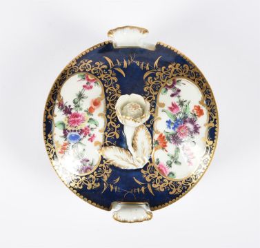 A WORCESTER BLUE-GROUND AND POLYCHROME PORCELAIN BUTTER DISH, COVER, STAND, AND SIDE-PLATE CIRCA 1775 Decorated with panels of flowers Fretted blue square marks The butter dish and stand 9cm high, 15cm diameterThe plate 21.5cm diameter Condition Report: Nibbles to the flower finial to dish, Rubbing to gilt generally from where the butter dish has sat, some wear to the plate.Condition Report Disclaimer