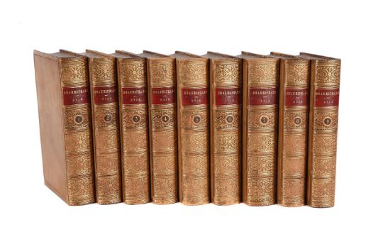 Ɵ SHAKESPEARE, WILLIAM, THE WORKS OF, REVISED BY THE REV. ALEXANDER DYCE CHATTO AND WINDUS, PICCADILLY, THIRD EDITION, 1877 In nine volumes, gilt and tooled leather bound Each 22cm high, 15cm wide (9)