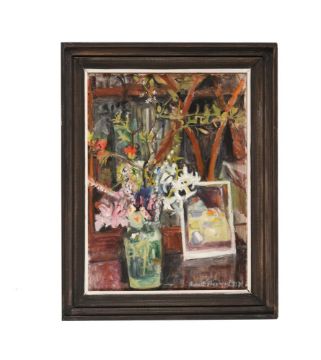 RUPERT SHEPHARD (BRITISH 1909-1992) STILL LIFE- FLOWERS AND A POSTCARD Oil on canvas Signed and dated 1974 (lower right) titled (verso) 41 x 30.5cm (16 x 12 in.)Provenance: Private Collection, Lady Caroline Conran  Please note measurements do not include frame unless otherwise stated Condition Report: No obvious condition issues. Please note Dreweatts is not liable for damage to picture frames.Condition Report Disclaimer