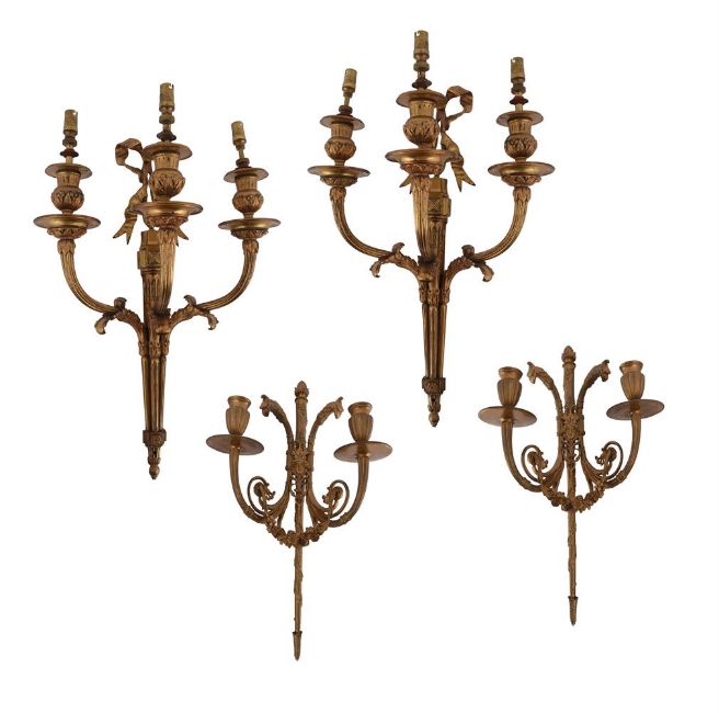 A PAIR OF THREE LIGHT WALL APPLIQUÉS IN LOUIS XVI STYLE