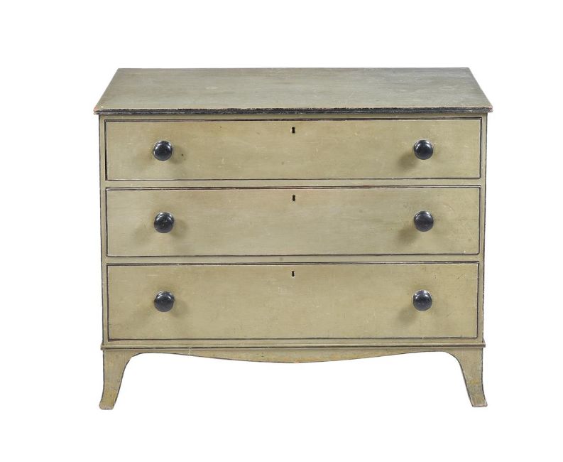 A REGENCY LIGHT GREEN PAINTED CHEST OF DRAWERS CIRCA 1820 87cm high, 105cm wide, 54cm deep Provenance: Private Collection, Lady Caroline Conran   Condition Report: Marks, knocks, scratched and abrasions consistent with age and use. The green painted surface with various marks and colour variation including old water damage. The handles appear to be original, as do the locks to the second and third drawers, the top drawer lock is missing. There are no keys present at the time of report. Overall solid and stable, backboards appear to be original, the moulded edge around the top particularly has various chips and losses. No restoration detected.Please refer to additional images for a visual reference to condition.Condition Report Disclaimer
