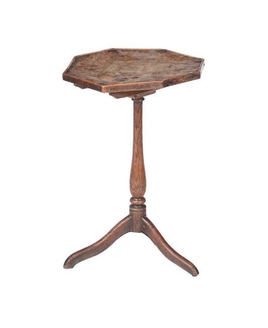 A BURR ELM AND ASH OCTAGONAL OCCASIONAL TABLE LATE 18TH CENTURY 66.5cm high, 43cm wide Provenance: Private Collection, Lady Caroline Conran Condition Report: Marks, knocks, scratches, abrasions consistent with age and useSplits and cracks,Chips and lossesThe top with unevenness and warping, marks and stains, There are signs of old woodworm to the underside of the top, also old losses and signs of being rough-hewn There is a later block to the underside of the catch-blockPlease see additional images for visual reference to condition  Condition Report Disclaimer
