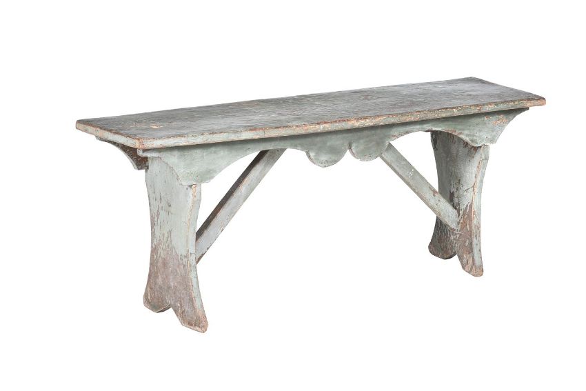 A CONTINENTAL PAINTED PINE LOW STOOL LATE 19TH CENTURY The underside with crown and CC cypher 49cm high, 126cm wide, 29cm deep  Provenance: Private Collection, Lady Caroline Conran