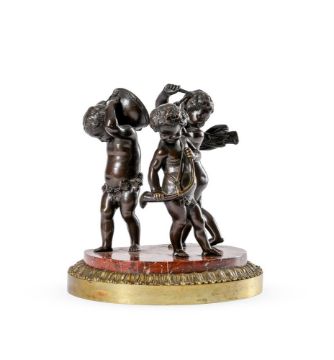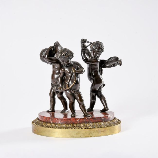 AFTER CLAUDE MICHEL CLODION (FRENCH, 1738 - 1814): A BRONZE FIGURAL GROUP OF THREE MUSICAL PUTTI LATE 19TH CENTURY The figures with one holding a hunting horn, another a kettle drum, on variegated red marble base and stiff leaf bronze plinth 21.5cm high, base 21cm wide Condition Report: The bronze with marks and signs of age and handling, the putto holding the drumsticks is slightly loose to the base Some minor nibbles to the marble Some discolouration to the base, the underside with some timber holding the elements together, this appears to be old woodPlease see additional images for visual reference to condition Condition Report Disclaimer