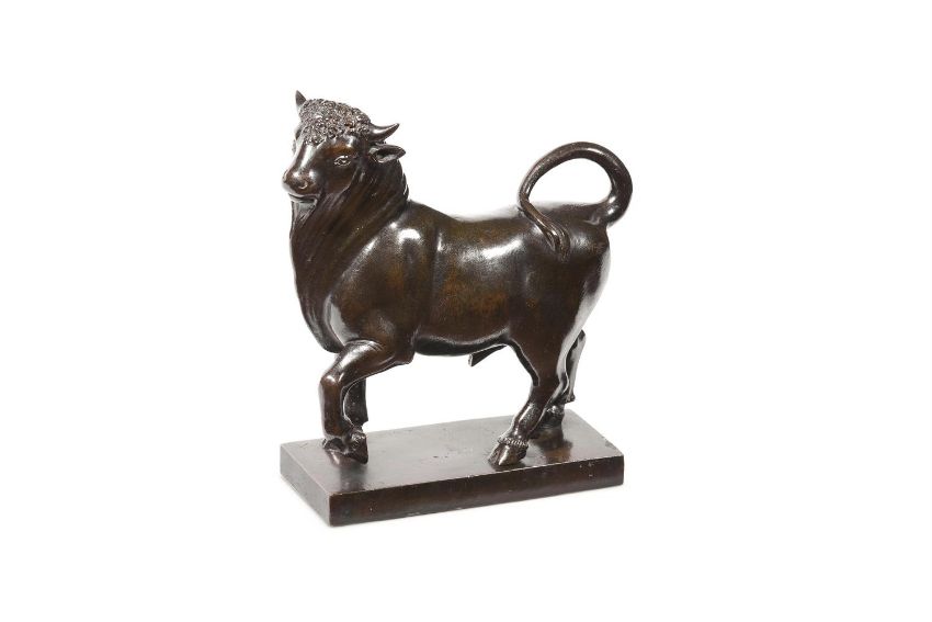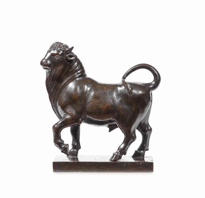 AN ITALIAN BRONZE FIGURE OF A STRIDING BULL 18TH CENTURY Set on plain rectangular plinth base 23.5cm high overall, base 18.5cm wide Condition Report: With rubbing to patina from age, handling, and use. Underlying colour a greenish yellow. Some engrained surface dirt to recesses. Connection points with plinth with later remedial strengthening Please see additional images for visual references to condition which form part of this condition report. All lots are available for inspection and Condition Reports are available on request. However, all lots are of an age and type which means that they may not be in perfect condition and should be viewed by prospective bidders; please refer to Condition 6 of the Conditions of Business for Buyers. This is particularly true for garden related items. We must advise you that we are not professional restorers or conservators and we do not provide any guarantee or warranty as to a lot's condition. Accordingly, it is recommended that prospective buyers inspect lots or have their advisors do so and satisfy themselves as to condition and accuracy of description All lots are offered for sale "as viewed" and subject to the applicable Conditions of Business for Buyer's condition, which are set out in the sale catalogue and are available on requestCondition Report Disclaimer