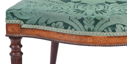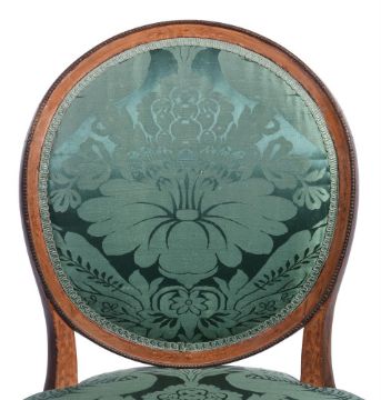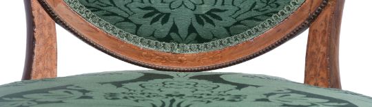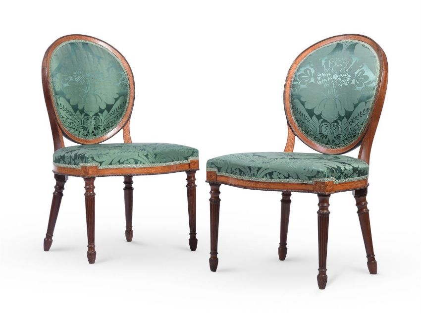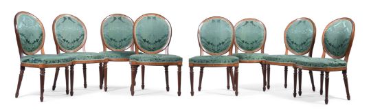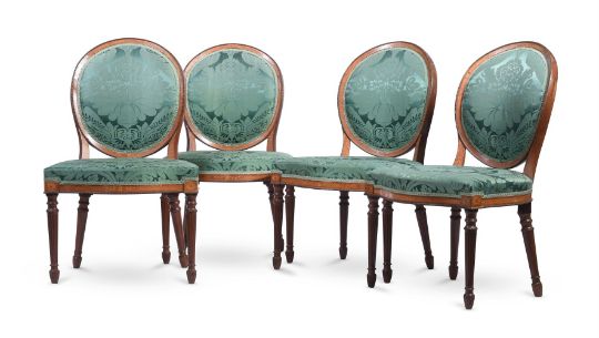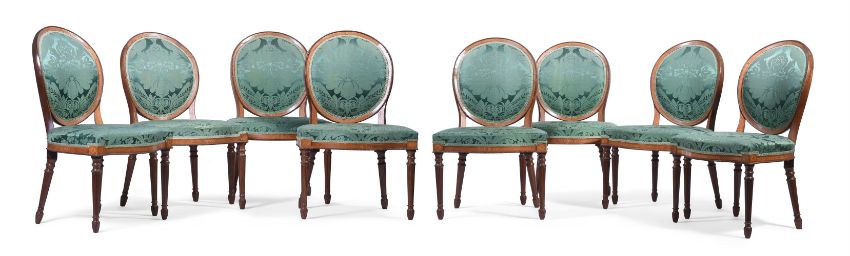 A SET OF EIGHT GEORGE III MAHOGANY, SYCAMORE AND MARQUETRY CHAIRS IN THE MANNER OF JOHN LINNELL (1729-1796), CIRCA 1780 each 91cm high, 56cm wide, 52cm deep overall Condition Report: Overall there are some scratches, marks, knocks, cracks and abrasions consistent with age and use.There are some losses, restorations and observations including:The upholstery has few signs of age except for one chair whose fabric is worn and torn to the front of the seat and one corner. There are repairs to the oval chair backs in particular to the joint areas where the uprights from the seat meet the back and to the sectional construction joints where the crest joins the sides of the back - some of the chairs have slight reduction in height to the backs presumably during the repair process.There is evidence of old worm.The marquetry is detailed and refined and unexpectedly to the sides and back of the chair seat rail.There is filler to the underside of some seat rails and inset later timber to the inner top area of seat rails and some later corner blocks.Please see the additional condition report photographs as a visual reference of condition. Condition Report Disclaimer
