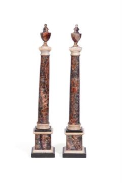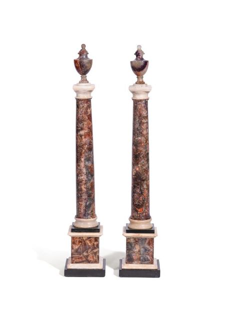 Each with urn finial above well figured columns, stepped bases