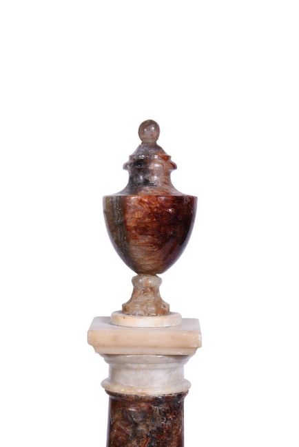Variance in colour between the two urns and slight difference in turning to upper banding- this may be original to the pieces from the selective use of minerals employed but one ball clear urn finial almost certainly later