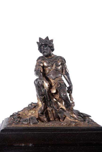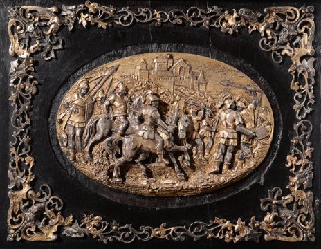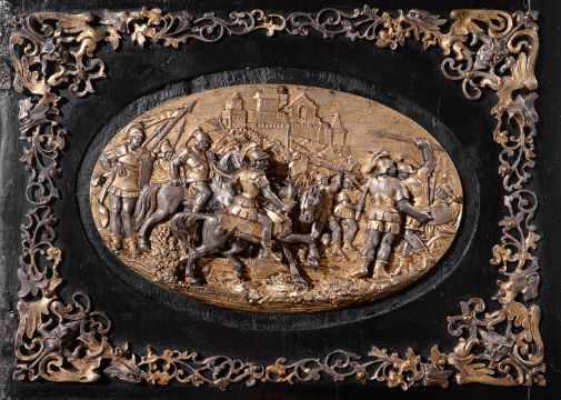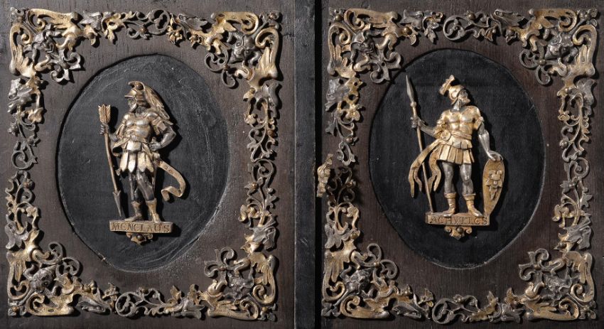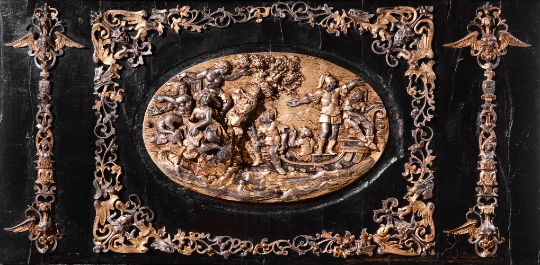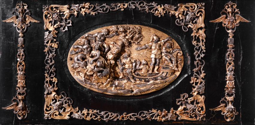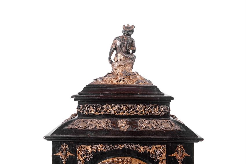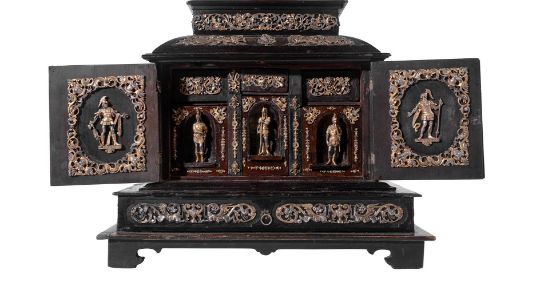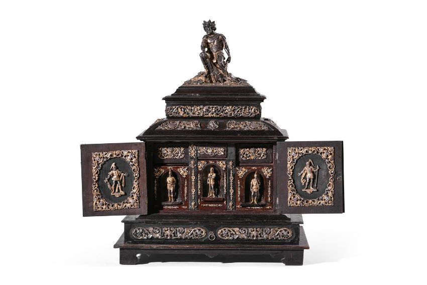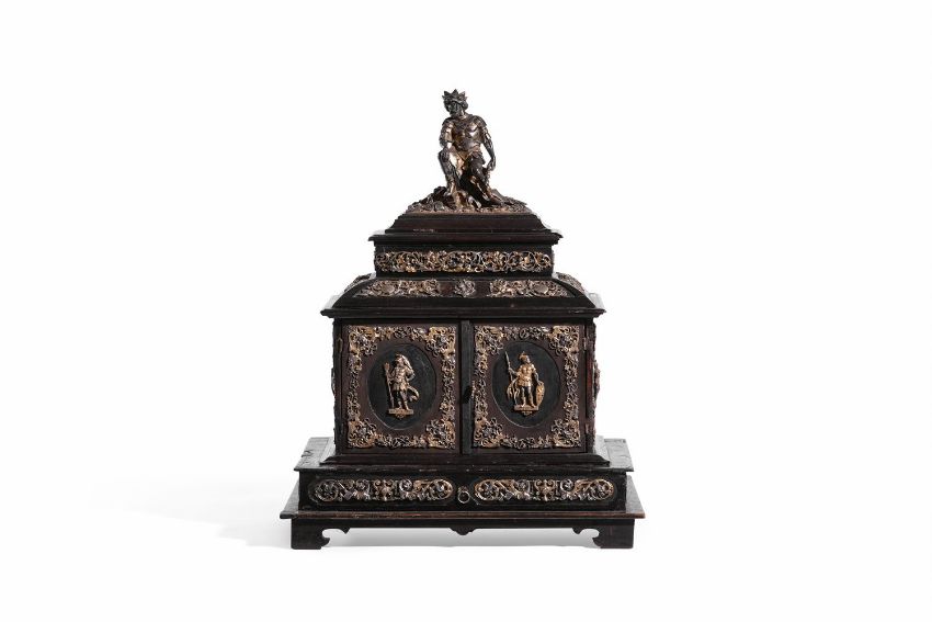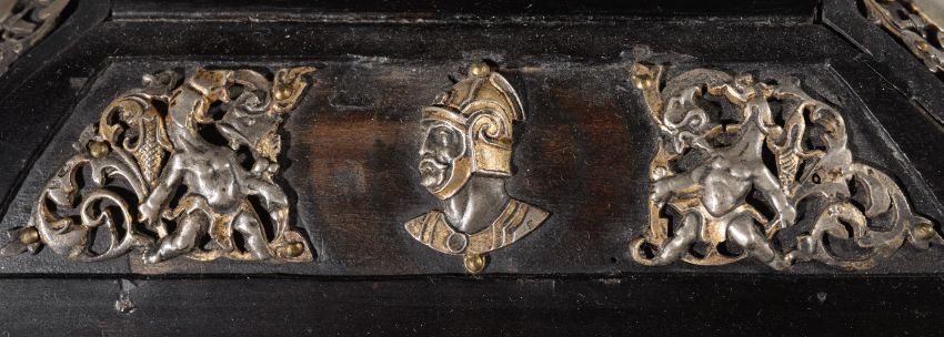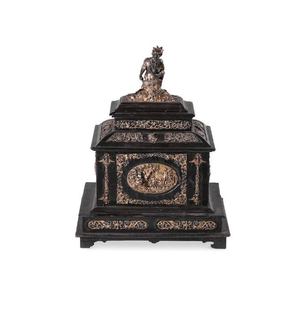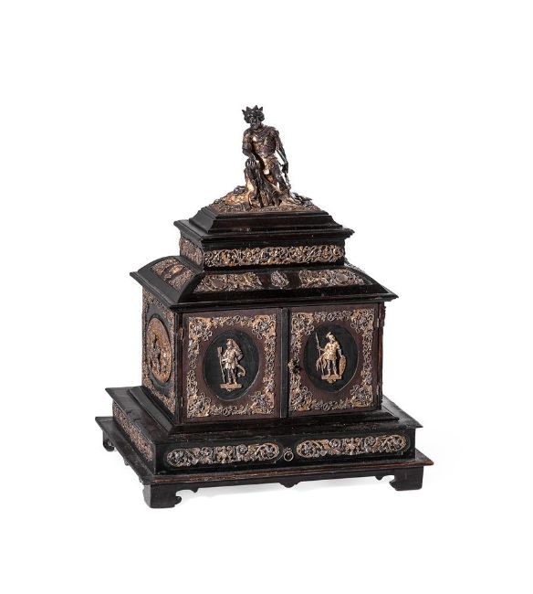 A CONTINENTAL SILVER AND SILVER GILT MOUNTED EBONISED TABLE CABINET AUSTRO-HUNGARIAN SMALL ARTICLE MARKS FOR 1872-1922, UNIDENTIFIED MAKER'S MARK The cabinet with slide top lid with seated figure, the whole with characters and scenes from the Trojan War including Achilles, Ajax, Patroclus 40cm high, 32cm wide, 25cm deep