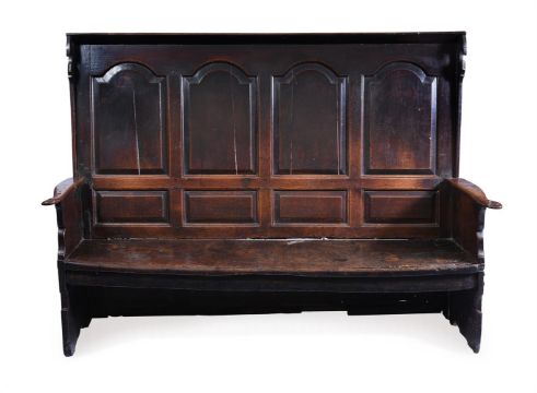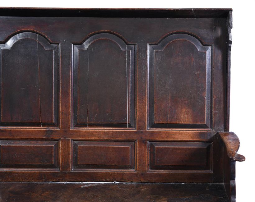 AN OAK AND BURR OAK SETTLE 18TH CENTURY 138cm high, 186cm wide, 57cm deep Condition Report: Old marks, scratches and abrasions comensurate with age and use.Old cracks, chips and splits and old losses. Old worm damage and old fragmentary loss in some areas as a result. Various old repairs including patches to the seat. Good colour and patina throughout. The surfaces of the arms are more worn and the base of the back as one would expect from use. There are two later elements of timber at each end of the reverse of the back to strengthen. These are attached with nails. They appear to be later but have age. There is also a later strip of timber attached to the lowest edge of the reverse of the bench. Nails and screws of various age (mainly 18th or 19th century) secure elements throughout. Of solid useable structure overall. There is some movement to the high back when weight is applied to it as one would expect. Please refer to all additional images available via email for visual reference to condition. Condition Report Disclaimer