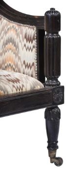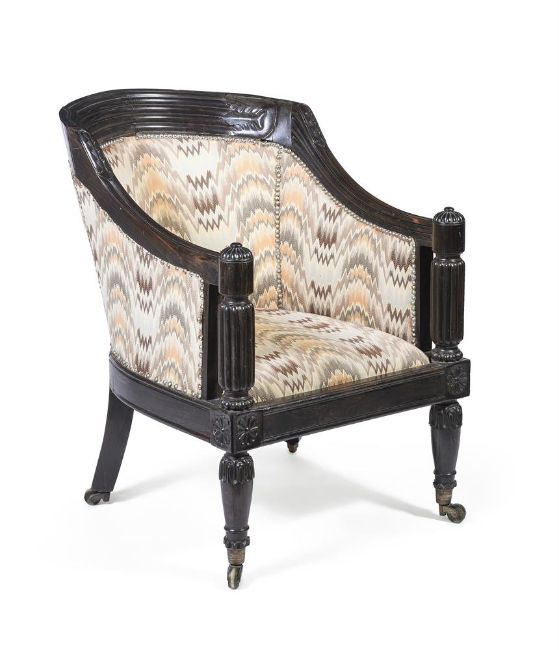 Y AN ANGLO-INDIAN EBONY 'TUB' ARMCHAIR FIRST HALF 19TH CENTURY 84cm high, 68cm wide, 83cm deep overall Condition Report: Chair with the marks, knocks, scratches and abrasions commensurate with age and use. Old splits and chips. Various old repairs to frame - see images for details. Both front castors stamped 'COPE'S PATENT'. Some slight movement within joins but frame is structurally solid overall. Please refer to additional images for visual reference to condition. Condition Report Disclaimer