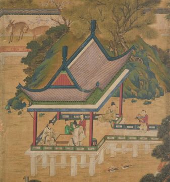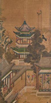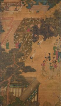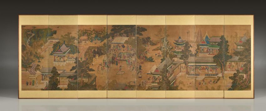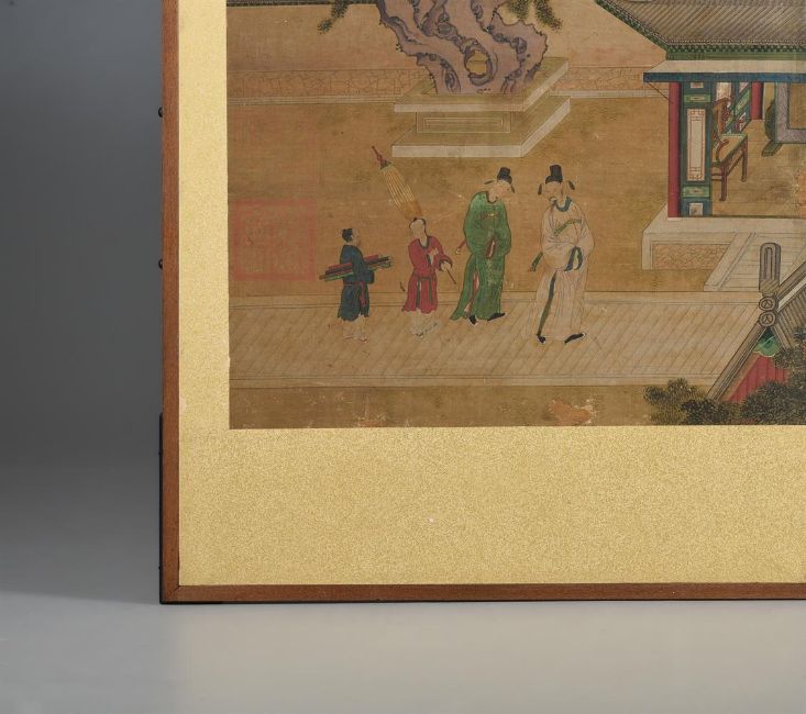 † Attributed to Kim Deuk-sin (金得臣, 1754-1822), Guo Ziyi's Banquet (Gwakbunyang Haengnakdo), a fine eight-panel screen, ink and colour on silk, with two seals of the artist, picture size 452cm x 130.5cmBIDDING FOR THIS LOT WILL BE BY TELEPHONE ONLY AND ONLINE BIDS WILL NOT BE ACCEPTED. IF YOU ARE INTERESTED IN THIS LOT PLEASE CONTACT DREWEATTS TO ARRANGE A TELEPHONE BID (+ 44 (0) 1635 553 553 | ytao@deweatts.com) 本件拍品仅接受电话竞价,网上竞价无效,如您有兴趣,请联系陶映雯博士(ytao@dreweatts.com) Provenance: From a private West Coast collection in the US and first purchased in Tokyo when the family ran the US occupying forces entertainment program in 1946. This eight-panel folding screen depicts a banquet honouring Guo Ziyi (697-781), a famed general of China's Tang dynasty (618-907). In addition to his individual achievements, he lived a long life until the age of 85 with a big family of eight sons and seven daughters who were all quite successful. Thus he became a paragon of Confucian loyalty and fortitude, and even deified in popular religion as a god of wealth and happiness. By the 17th century in China, Guo's reception had become a metaphor for auspicious birthday celebrations in general and was depicted in various media, e.g., blue and white porcelain, embroidery and lacquer, conveying a wish for longevity, wealth, and rank. See a set of twelve embroidered 'Celebration Scene' hanging scrolls, 17th century, at the Metropolitan Museum (accession number 2019.445.1a-I).As such, screen paintings illustrating similar themes delivered a didactic message and emphasised the Joseon admiration for and imitation of Ming imagery. Based on the Chinese prototypes, Joseon's paintings of Guo Ziyi were newly composed in the style of court painting in splendid dark colours, and were mainly produced as folding screens.Kim Deuk-sin (1754-1822) was the son of a royal court painter, Kim Eungri (金印履), and followed in his father's footsteps. He entered royal service as a member of the Dohwaseo (圖畵署), the official painters of the Joseon court. His work showed the influence of Kim Hong-do(金弘道), and excelled at landscape and genre paintings in particular. Scattered worldwide in major museums such as the Metropolitan Museum, Philadelphia Museum of Art and National Palace Museum of Korea, there are about 47 screens of the same topic remaining today but mostly painted by unknown artists. Only very few examples are signed and stamped. Compare with a similar screen depicting the banquet by Kim Deuk-sin at the National Museum of Korea (accession number Deoksu 1508). Guo is depicted in the present work at centre of the banquet in his honour, enjoying a dance performance surrounded by his large family in a palatial residence with flowering trees, cranes, deer, and birds. His sons and sons-in-law (八子七婿) standing by his sides are all dressed in official costumes, and his grandsons frolicking in front of him. Covered with auspicious clouds on top, the painting also features cranes, deer, and pine trees wishing for longevity, and peonies symbolising wealth and prosperity are in full bloom. Screens like this would have been used at celebrations and given as congratulatory gifts to distinguished individuals and royal families.김득신 곽분양행락도 8폭병풍朝鮮王朝 (傳)金得臣(1754-1822)《郭汾陽行樂圖八開屏風》設色絹本款識:兢齋,金得臣印 拍品來源:美國西海岸私人家族收藏,其於1946年於日本錄製美軍娛樂節目時購自東京  Condition Report: Overall the screen with some discoloration, fraying and losses, especially along edges and around hinged areas. Hinges partly restored but still with two broken. The back board with wear, losses, and scattered insect damage.multiple areas of silk loss to the painting commensurate with age, small areas of old patch repairs, the central scene depicting the dancer with some scattered black splashes to the lower area. One panel with two punctured areas to the back board.Please refer to detailed images for visual reference of the conditionCondition Report Disclaimer