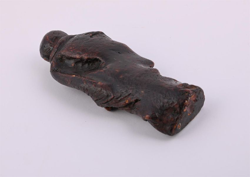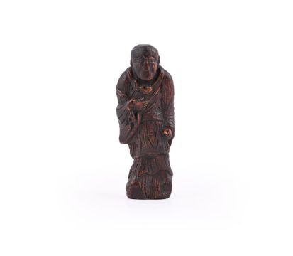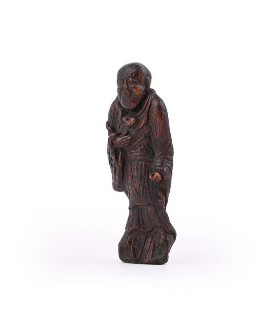 A Chinese carved wood figure of a Buddha, Ming Dynasty or early 18th century, probably Aloeswood, standing wearing flowing robes, with old brown patina, 13.5cm high, weight 45 grams明至十八世紀 沉香木(可能)雕佛像(克重45g) Condition Report: wear to surface Condition Report Disclaimer