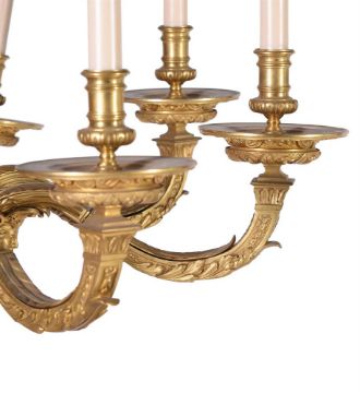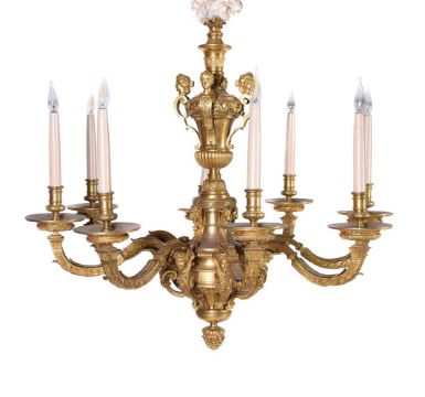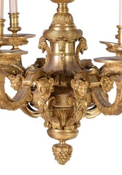 AN ORMOLU EIGHT LIGHT CHANDELIER AFTER THE MODEL BY ANDRE CHARLES BOULLE, FRENCH MID TO EARLY 20TH CENTURY With herm, mask and ram head decoration to the central stem and eight scrolling branches, fitted for electricity, apparently unmarked approximately 76cm high, 84cm wide Condition Report: Wear, marks, knocks and scratches as per age, handling, use, and cleaning. Some replacement screws visible throughout and one arm has slipped slightly on the stem, some wear to edges, cleaning has led to some colour variances between stem and branches, surface dirt ELECTRICAL GOODS. These are sold as decorative items only and if bought for use must be checked over for compliance with safety regulations by a qualified electrician before use. Please see additional images for visual references to condition which form part of this condition report. All lots are available for inspection and Condition Reports are available on request. However, all lots are of an age and type which means that they may not be in perfect condition and should be viewed by prospective bidders; please refer to Condition 6 of the Conditions of Business for Buyers. This is particularly true for garden related items. We must advise you that we are not professional restorers or conservators and we do not provide any guarantee or warranty as to a lot's condition. Accordingly, it is recommended that prospective buyers inspect lots or have their advisors do so and satisfy themselves as to condition and accuracy of description All lots are offered for sale "as viewed" and subject to the applicable Conditions of Business for Buyer's condition, which are set out in the sale catalogue and are available on request. Buyers are reminded that liability for loss and damage transfers to the buyer from the fall of the hammer. Whilst the majority of lots will remain in their location until collected, we can accept no responsibility for any damage which may occur, even in the event of Dreweatts staff assisting carriers during collection.Condition Report Disclaimer