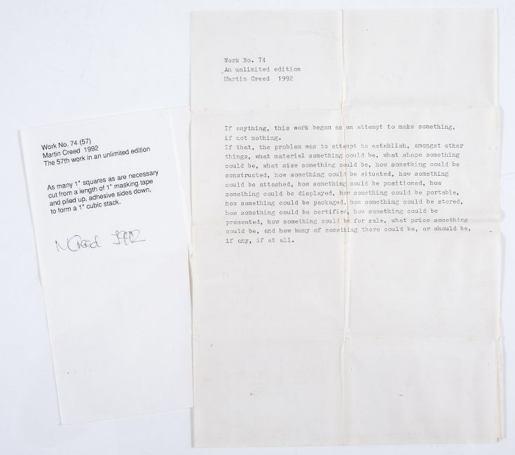 Martin Creed describes the work ''As many 1" squares as are necessary cut from a length of 1'' masking tape and piled up, adhesive sides down to form a 1'' stack.'