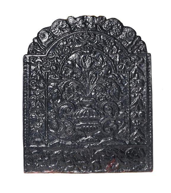 A CAST IRON FIRE BACK PROBABLY FRENCH, 18TH CENTURY The centre with flowers in an urn 91cm high, 74cm wide