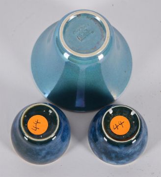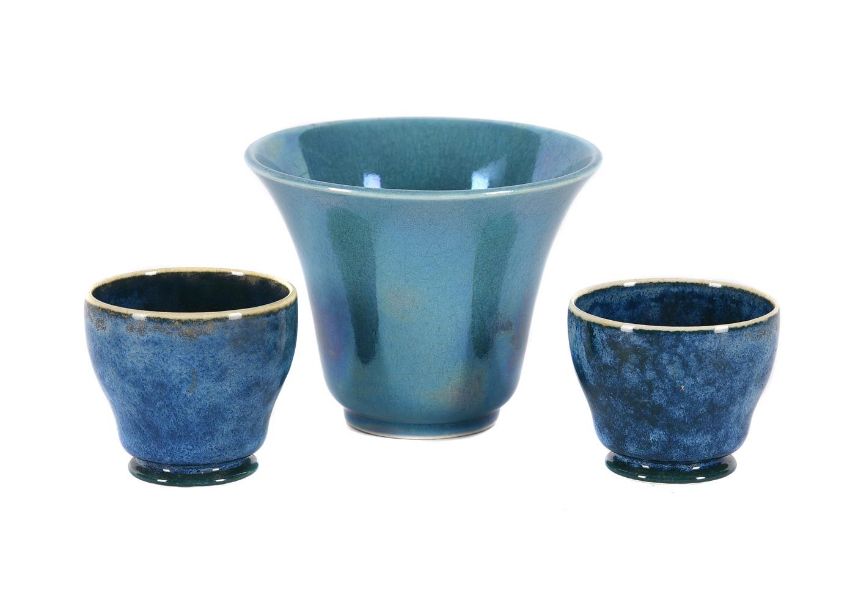 TWO UNUSUAL RUSKIN POTTERY LOW-FIRED EGG CUPS CIRCA 1927-1933 with mottled blue and green glazes and A RUSKIN POTTERY LOW-FIRED FLARED BOWL with light blue glaze impressed 'RUSKIN ENGLAND 1922' the egg cup 4cm high and the bowl 6cm high (3) Provenance: Adam Robert Ferneyhough Robert James Ferneyhough (1919-1977) William Howson Taylor (1876-1935) Condition Report: in good conditionCondition Report Disclaimer
