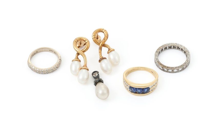 To include a sapphire and diamond ring, with a trio of oval cut sapphires, to channel set graduated brilliant cut diamond shoulders, approximately 0.32 carats total, 18 carat gold 2004 hallmark; together with a pair of 9 carat gold crossover freshwater pearl earrings; an eight cut diamond half eternity ring, stamped 18ct; a white paste set ring; and a simulated pearl pendant
