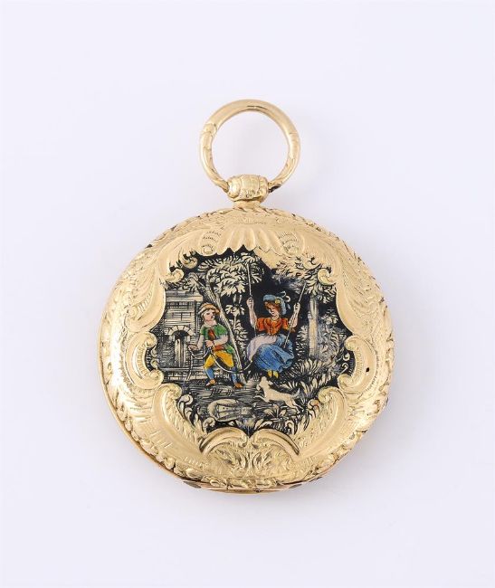 Case: Gold four piece hinged case, the back cover enamelled with a courting couple within a C-scroll reserve