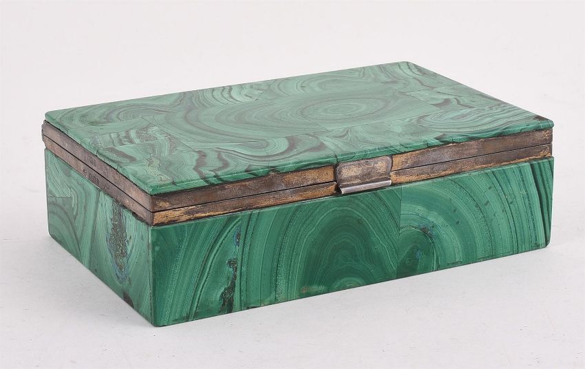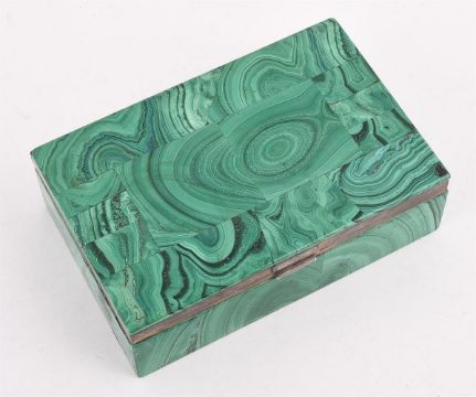 A SILVER MOUNTED MALACHITE CIGARETTE BOX