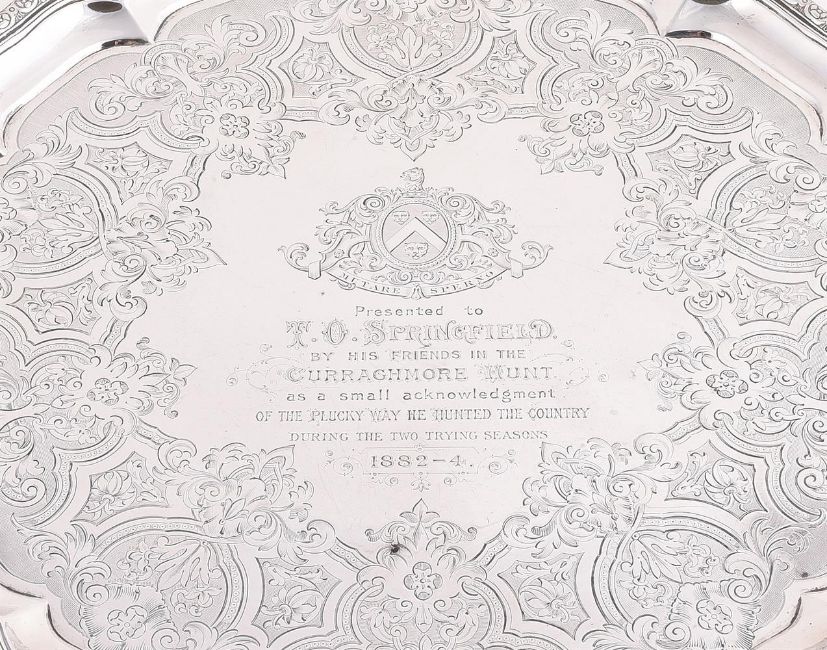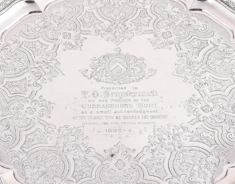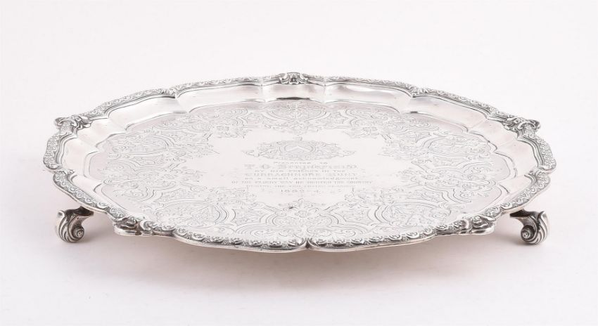 With a chased flower heard, cross and foliate border, engraved with a foliate and strap work band, an armorial and presentation inscription, on four foliate scroll feet