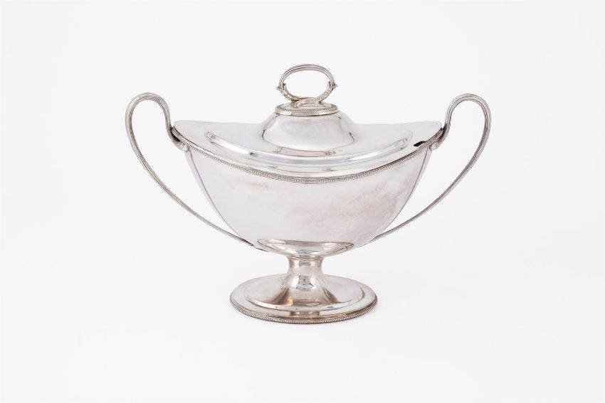 With a reeded loop handle to the domed cover, beaded borders, twin loop handles and on an oval pedestal foot