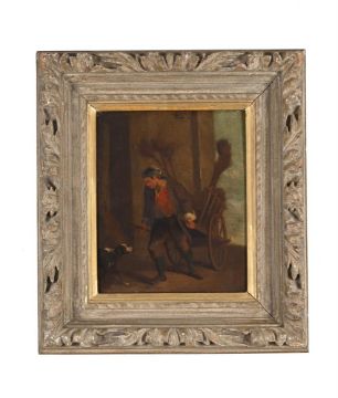 FRENCH SCHOOL (LATE 18TH/19TH CENTURY) CHIMNEY SWEEP WITH DOG Oil on panel 27 x 22cm (10½ x 8½ in.)Please note measurements do not include the frame unless otherwise stated. Condition Report: Thick varnish throughout and surface dirt. Some light scattered losses to the left edge and corner. Inspection under UV reveals no obvious evidence of retouching or repair and a thick varnish throughout. Please note Dreweatts are not liable for damage to frames or mounts. Condition Report Disclaimer