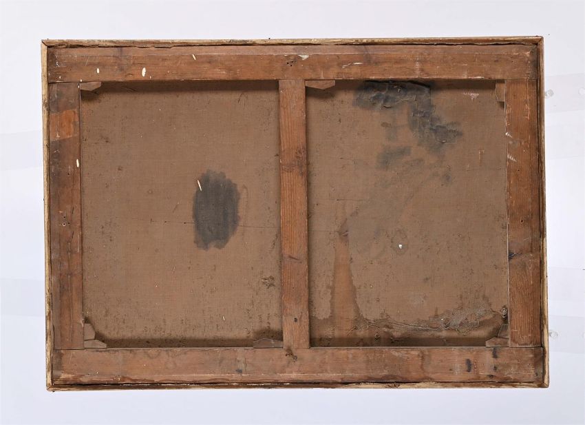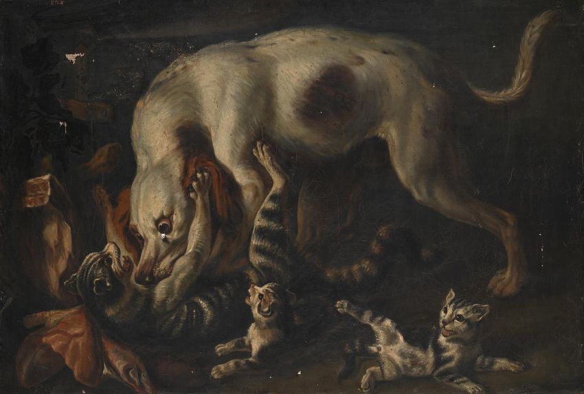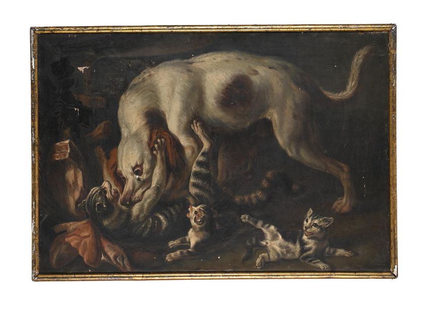 FOLLOWER OF NICASIUS BERNAERTS A DOG ATTACKING KITTENS Oil on canvas 70 x 102cm (27½ x 40 in.) Please note measurements do not include the frame unless otherwise stated Condition Report: The canvas presents a visible craquelure sparse across the surface. Many damages are present on the surface, such as a hole under the dog's eye, several scratches in the right side, and losses of paint on the upper left border. UV light reveals that the plant painted om the left border has been added. Please note Dreweatts are not liable for damage to frames or mounts.Condition Report Disclaimer