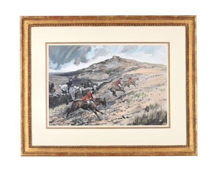 THOMAS IVESTER LLOYD (BRITISH 1873 - 1942) THE HUNT Watercolour and bodycolour Signed with initials (lower right) 35.5 x 53cm (13¾ x 20¾ in.) Measurements do not include the frame unless stated. Condition Report: There are one or two surface scratches in both the upper left and lower right corners. A couple of scattered spots of brown and white foxing throughout. Unexamined under glazed frame.Please note Dreweatts is not liable for damage to frames.Condition Report Disclaimer