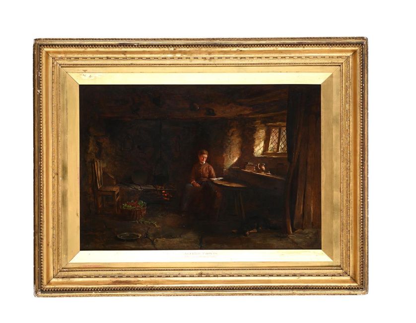 ALFRED PROVIS (BRITISH 1843-1886) THE GAMEKEEPER'S WIFE Oil on canvas Signed (lower right) 44 x 64.5cm (17¼ x 25¼ in.) Provenance: Sale, Sotheby's Belgravia, Fine Victorian Paintings, 15 June 1982, lot 157 Please note measurements do not include the frame unless otherwise stated. Condition Report: The canvas has been relined and presents a thick layer of varnish. UV reveals various retouches across the whole surface, starting from the left border, where most of the surface next to the edge has been repainted, to the scattered retouches in the background area, including a few retouches on the figure. Please note Dreweatts are not liable for damage to frames or mounts.Condition Report Disclaimer