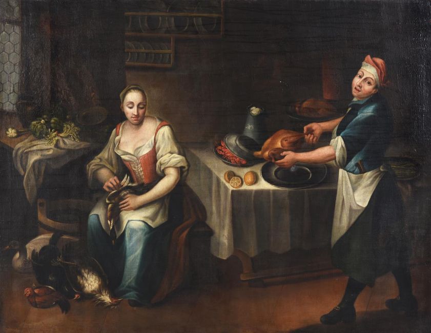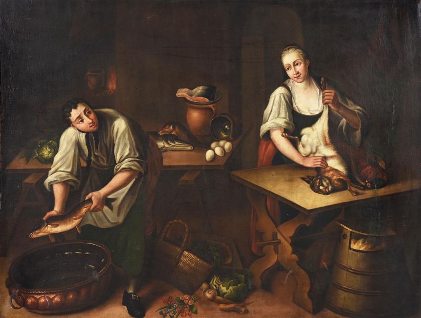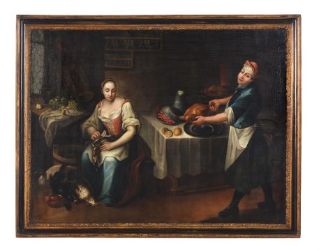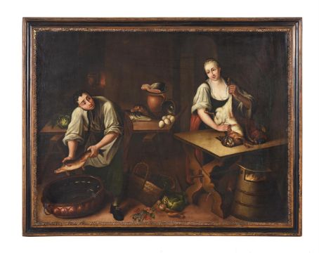 GERMAN PROVINCIAL SCHOOL (18TH CENTURY) A PAIR OF KITCHEN SCENES Oil on canvas 113 x 150cm (44¼ x 59 in.) (2) Provenance: Private collection, Blaisdon Hall, GloucestershirePlease note measurements do not include the frame unless otherwise stated. Condition Report: Please note Dreweatts are not liable for damage to frames or mounts.Condition Report Disclaimer