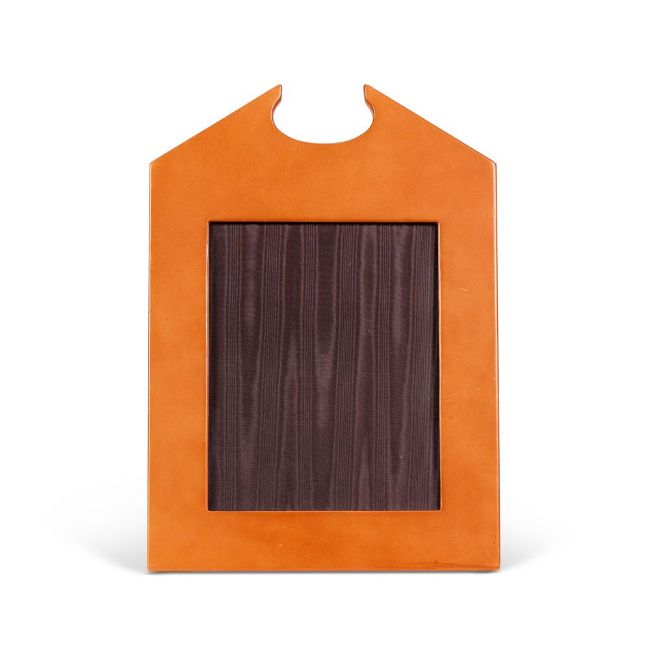 A TAN LEATHER PHOTO FRAME WITH SWAN NECK PEDIMENT BY LINLEY The strut is stamped 'LINLEY' to take 24.5cm high, 20cm wide; 41.5cm high, 29.5cm wide overall Condition Report: Some minor marks to the tan leather.Condition Report Disclaimer