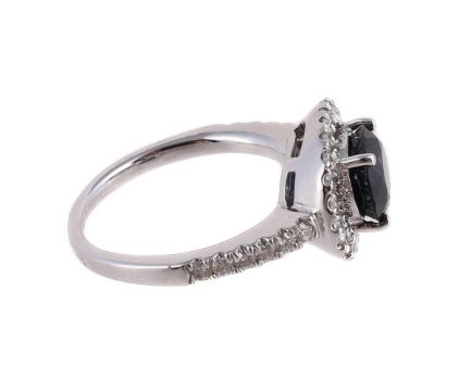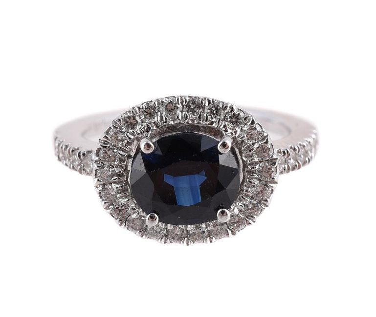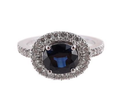 The oval cut sapphire in a four claw mount, to a brilliant cut diamond halo surround and shoulders, the hoop stamped 750