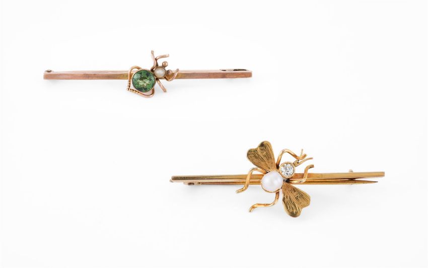 The first a diamond and freshwater pearl fly, the old cut diamond approximately 0.10 carats total, with naturalistic wings, the bar stamped 9ct; the second bar brooch set with a spider, with circular cut peridot abdomen, with a half pearl head, on a polished bar, stamped 9ct