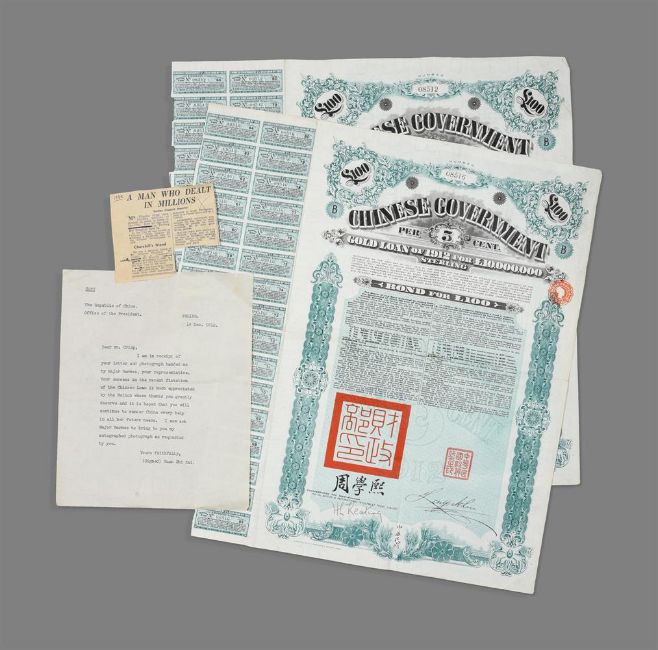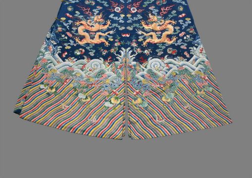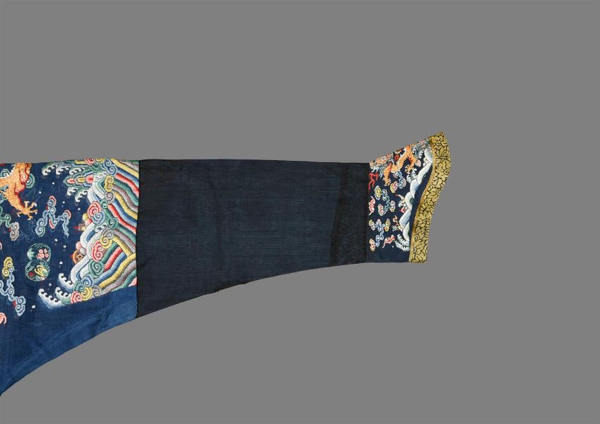 A fine Chinese five-colour cloud blue-ground summer gauze 'Dragon' robe, Jifu, Qing dynasty, first half of the 19th century, the blue silk gauze worked in couched gold thread and fine counted stitch with nine five-clawed dragons pursuing flaming pearls amidst five-colour clouds interspersed with bats and melons or persimmons above a wide terrestrial diagram and lishui stripe separated by billowing ruyi-shaped clouds, with similar decoration repeated on the border, collar and horse shoe cuffs, with midnight-blue silk gauze sleeve extensions, 207cm cuff to cuff x 144cm hem to collar; sold with two sheets of Chinese Government 5% Gold Loan, 1912, £100 ("Crisp loan") Provenance:By family inheritanceCharlotte Victoria Hunt (nee Crisp) until 1964Collected by Charles Birch Crisp (1887-1958) in Peking circa 1912Charles 'Chinese' Crisp was a financier known as 'Chinese' Crisp because of his work in raising finance for the Chinese Government, culminating in a five million pound Bond issue in 1912. He was also a personal friend of Sir Winston Churchill, but in later years Mr Crisp fell on hard times, and in 1953 sold at Sotheby's personal letters written to him by Sir Winston Churchill. A very similar blue gauze dragon robe, is illustrated by C. Hall et al., Power Dressing, Textiles for Rulers and Priests from the Chris Hall Collection, Asian Civilizations Museum, 2006, p. 147, no. 23, where the authors note that, 'blue was the colour used on dragon robes worn by the third and fourth degree princes, nobles down to the eleventh degree, and officials'. They further state that the appearance of the five-clawed dragons, together with the colour and style, indicate that the robe was likely made to be worn by a third or fourth degree prince or noble, as would have been the case with the present robe.清十九世紀早期 石青地納紗彩雲金龍紋吉服袍拍品來源:Charles Birch Crisp (1887-1958) 于1912年左右購自北平,後由家族傳承,他為英國前首相丘吉爾密友,並曾幫助北洋政府發行了總價約五百萬鎊的國庫券。 Condition Report: in fine condition other than some minor loose gold threads loose and other minor faults and very minor fading  Condition Report Disclaimer