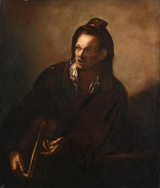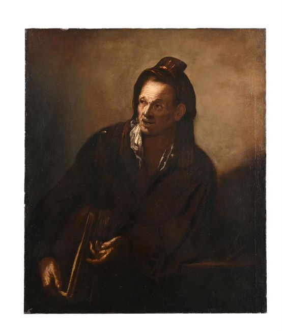 NEAPOLITAN SCHOOL (17TH CENTURY) PORTRAIT OF A PHILOSOPHER Oil on canvas Signed with monogram 'R' (lower right) 117.5 x 100.5cm (46¼ x 39½ in.) Unframed A photograph (n.52256) of 1964 held in the Zeri Collection shows that part of the veil above the head was once covered with white paint. Condition Report: The canvas has recently been relined and presents various damages at the borders, where quite evident sections of paint have fallen. UV light reveals an unevenly thick applied varnish, various retouches on the head, such as on the mouth, chin, nose, and on the forehead, especially on the creases. Extensive retouching has been done on the bust of the figure, a 40cm diameter patch of painting fluoresces, and might have been entirely restored. Likewise, most of the upper left corner fluoresces as well. To conclude, various marks and superficial damages are present on the borders, especially on the left border and bottom left corner.Condition Report Disclaimer