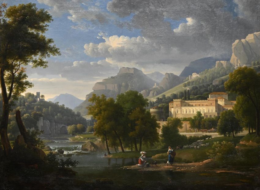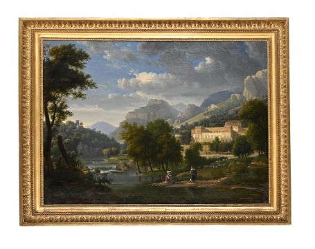 ALEXANDRE HYACINTHE DUNOUY (FRENCH 1757-1841) FIGURES IN AN ITALIANATE LANDSCAPE Oil on canvas Signed and dated '1810' (lower left) 74 x 99cm (29 x 38¾ in.) Provenance: Anonymous sale, Paris, Thierry de Maigret, 10 December 2001, lot 70, for 600,000 French francs (or approximately £56,978) With David Wade Fine Art, Yorkshire where acquiredAlexandre Hyacinthe Dunouy spent the years 1810-15 in Naples at the behest of its queen, Napoleon's sister, Caroline Bonaparte Murat (1782-1839). Consequently, numerous views of the city survive from this period of his career, including his Panoramic view of the Bay of Naples, National Gallery, London, and two examples in the Metropolitan Museum of Art, New York.1 The present canvas, signed and dated 1810, was likely painted at the beginning of this Italian sojourn, but perhaps before Dunouy had travelled that far south. Although none of the compositional elements can be identified as Neapolitan, the sun-bathed building on the right is certainly Italianate in its architecture. 1 Inv. no. L822 (dated about 1783-89 or 1810-15, the two periods during which Dunouy is thought to have travelled to Italy), oil on paper laid on canvas, 29.2 x 45.2 cm.; Accession no. 2009.400.52 (dated 1813), oil on paper, laid down on canvas, 33.3 x 50.5 cm.; and accession no. 2003.42.25 (dated about 1810-15), oil on paper, laid down on canvas, 21.2 x 29.2 cm Condition Report: The canvas presents a subtle craquelure most visible in the mid and upper section on the painting. UV light reveals few retouches, such as an 8cm long and 1cm thin diagonal restoration on the upper left corner of the sky, a few scattered retouches on the lower border section on the water, and a few dotted and minor retouches in the sky. In addition, under UV light some sections of the green pigment in the water on the bottom right corner fluoresce, possibly caused by some strengthening in the paint. Condition Report Disclaimer