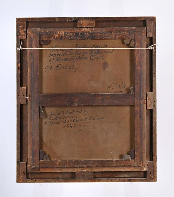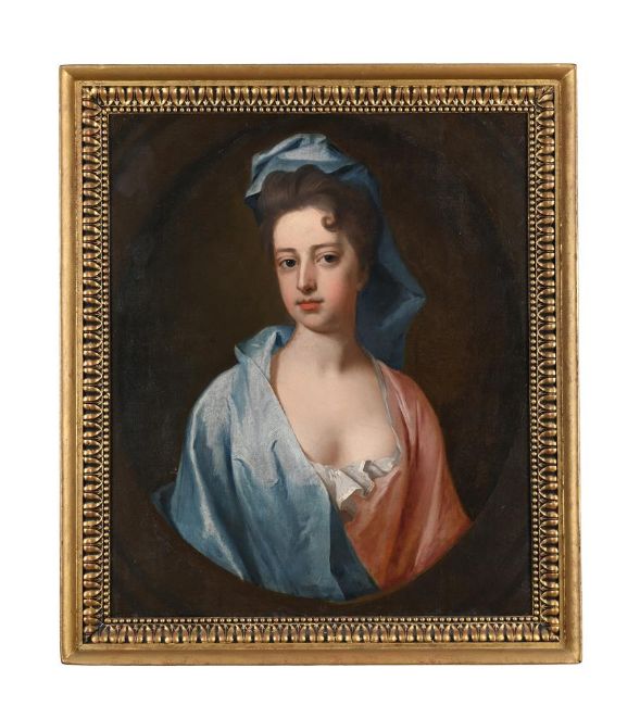 ATTRIBUTED TO MICHAEL DAHL (SWEDISH 1659-1743) PORTRAIT OF KATHARINE BRISTOW, AGED 17 Oil on canvas, feigned oval Bears signature 'Dahl' (lower right); with 19th century inscription 'KATHARINE BRISTOW AETAT 17, MARRIED TO GEORGE DASHWOOD OF HEVENINGHAM ESQ, 1711, AETAT 21 / BY DAHL / LINED AND RESTORED BY C. AMBROSE TAVISTOCK STREET COVENT GARDEN 1840' (verso) 76.5 x 64cm (30 x 25 in.) Provenance: From a Private Collection in NorthamptonshireGeorge Dashwood (1680 - 1758) was the Tory MP for Stockbridge. His father, Sir Samuel Dashwood (1643 - 1705) became the Mayor of London in 1702. Katharine (1690-1779), also came from a family of politicians; her father being Robert Bristow (1662 - 1706), MP for for Winchelsea. Here two brothers, Robert (1688-1737) and John (1701-1768) were also MPs. Upon his death in 1758, Katharine served as Lady of the Bedchamber to Queen Charlotte, the Queen Consort of George III. Condition Report: The canvas is relined and presents a visible craquelure at the corners of the painting, external to the feigned oval. UV light reveals a thick varnish in the background area, a few retouches on the forehead of the sitter, a small dotted retouch on the side of the mouth, a horizontal retouch of about 5cm at the height of the neck, and scattered smaller retouches on the clothing. In addition, there seems to be some strengthening at the contours of the upper section of the figure. To conclude, where there is the line of the oval, there is some superficial scratching, maybe caused by the abrasion of a previous oval frame. Condition Report Disclaimer