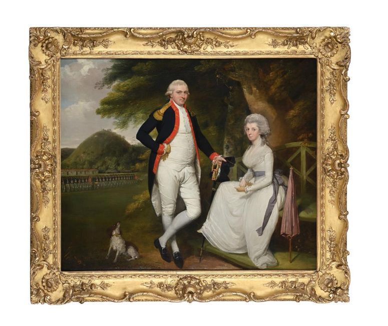 ROBERT HOME (BRITISH 1752-1834) PORTRAIT OF LIEUTENANT-COLONEL WILLIAM SYDENHAM AND HIS WIFE, WITH ST THOMAS'S MOUNT, MADRAS IN THE BACKGROUND Oil on canvas 77.5 x 92.1cm (30½ x 36¼ in.)Painted circa 1791.Provenance: Arthur Tooth, London, 1946-7 (advertisement in The Connoisseur, March 1946) Private collection, UK  Literature: Mildred Archer, India and British Portraiture 1770-1825, London 1979, pp.306-8, pl.212 William Sydenham (1752-1801), the son of Samuel Sydenham and Alice (née Chapman) of Minehead, came from a distinguished Devonshire family. He joined the East India Company's Madras Artillery as a Cadet in 1768. In 1776 he married Amelia Prime, niece of General Horne, who had also served with the Artillery in India. In 1786, at the time of the war with Tipu Sultan of Mysore, Sydenham was promoted to Lieutenant-Colonel in command of the First Battalion at St Thomas's Mount near Fort St George, Madras, which can be seen in the background of this painting. Home was a fine landscape painter and detailed landscape backgrounds give extra vividness to his portraits. William Sydenham was promoted to Major-General, Commandant of Artillery and AuditorGeneral of Fort St George in January 1801, but died in June of that year. Robert Home was an important recorder of British India in the late eighteenth and early nineteenth century. He studied with Angelica Kauffmann and between 1773 and 1778 worked in Italy. He exhibited twenty paintings at the Royal Academy between 1770 and 1789. His wife died in 1790 and the following year travelled to Madras to seek his fortune, just as General Cornwallis was setting off with the Grand Army for the Third Mysore War against Tipu Sultan. Home accompanied the campaign, making sketches of the forts and engagements; he later produced prints of Select Views in Mysore (1794) and paintings of Lord Cornwallis receiving the sons of Tipu Sultan as hostages and The death of Colonel Moorhouse (both c.1793-4; National Army Museum, London). Influenced by Thomas and William Daniell, who visited Madras in 1792, Home produced a number of landscapes which show exquisite attention to architecture and Indian life. In 1795 Home moved to Calcutta; he made a happy second marriage and his children joined him in India, all four sons becoming members of the East India Company's army. Home, a punctual, amiable and hardworking man, became the chief portrait painter in Calcutta. He painted the Governor-General of India, Marquis Wellesley, and his brother Major-General the Hon. Sir Arthur Wellesley (the future Duke of Wellington), as well as other generals and judges. He made a short visit to Dacca in 1799 to paint the Nawab Nasrat Jang. Home's successful portrait practice was threatened by competition from Thomas Hickey, who arrived in Calcutta in 1807, and by the dashing and eccentric George Chinnery, who arrived in 1811. In 1814 Home took up the post of Court Painter to the Nawab of Oudh at Lucknow. He worked for the Anglophile Nawab Ghazi-ud-din Haidar for thirteen years, painting portraits and court life, and designing Ghazi's crown when he was made King of Oudh in 1819, as well as carriages, boats, furniture, even an elephant goad. Home retired to a 'handsome establishment' at Cawnpore after Ghazi-ud-din's death in 1827, dispensing 'extensive hospitality to the residents of the station' until his own death at the age of eighty-two in 1834 Condition Report: The canvas has been lined. Light craquelure throughout however the paint surface appears stable. There is an old repair (approx. 5cm) running vertically through one of the soldiers to the left of the canvas, and this is visible in natural light. There is a further, very small patch of overpaint visible in natural light, to the sitter's skirt (approx. 5mm). Rubbing and abrasions to the framing edges. Inspection under UV light reveals scattered retouching and infilling throughout.Condition Report Disclaimer