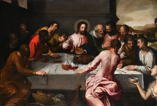 VENETIAN SCHOOL (16TH CENTURY) THE LAST SUPPER Oil on canvas, unframed 93.5 x 141.5cm (36¾ x 55½ in.) Unframed Condition Report: The canvas is relined and presents craquelure which is most visible in the upper right corner, in the section of the sky. UV light reveals an uneven applied varnish and various retouches scattered across, most evident on the figures and on the cloth of the table. The most significant signs of retouching are on the first figure in the foreground, where a zig zagged restoration covers what might have been a past tear. Further extensive retouching is present on the brown background area around the head of the third apostle to the right of Christ. To conclude the edges of the canvas have been cut abruptly as the painting was most definitely a much bigger canvas. Condition Report Disclaimer