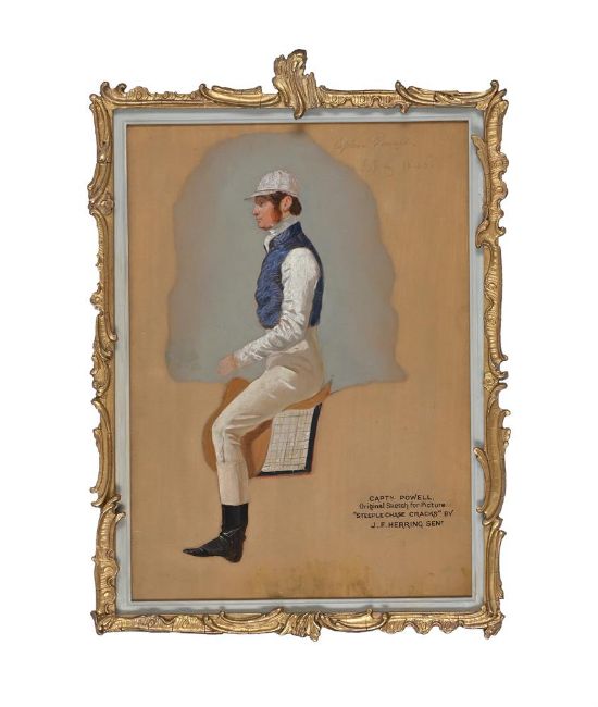 JOHN FREDERICK HERRING SENIOR (BRITISH 1795-1865) THE STUDY OF CAPTAIN POWELL, FOR STEEPLECHASE CRACKS Oil on panel Signed, inscribed, and dated 'Captain Powell 1846' and 'Captn Powell Original sketch for picture 'Steeplechase Cracks' by J F Herring Sen' (upper right and lower left respectively) 42 x 30cm (16½ x 11¾ in.)This work is a study for Herring's celebrated painting The Steeplechase Cracks, 1846, which is in The Royal Collection and was formerly in the collection of the late Queen Elizabeth, The Queen Mother.The picture shows a field of twelve taking a jump in a point-to-point. The 12th Earl of Strathmore is depicted on his horse Switcher. The collection also includes preparatory portrait sketches for the picture including The Earl and also Jem Mason, the winner of the 1839 Grand National. (John Cornforth, Queen Elizabeth, The Queen Mother at Clarence House, 1996, P.81-2)The Steeplechase Cracks was engraved by J. Harris and published by Messrs. Fores in 1852 as no. 2 of the National Sports Series. A similar sketch by Herring for The Steeplechase Cracks, of the highly successful Irish amateur jockey Allan McDonough, was sold as part of the Bill Blass Collection (Sotheby's, New York, 21-23 October 2003, lot 313)Provenance: Captain Powell, and thence by descent.    Condition Report: There is an area of discolouration to the lower framing edge (see images), however it is unclear whether this is original to the conception of the work. There is a surface scratch (approx. 10cm) to the background left of the sitter's face. Inspection under UV reveals some light scattered retouching, predominantly to the pale blue pigment around the sitter. Unexamined out of glazed frame. Condition Report Disclaimer