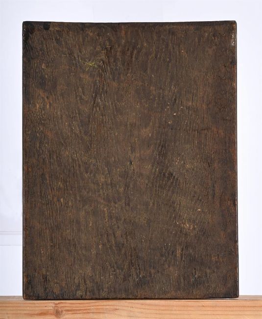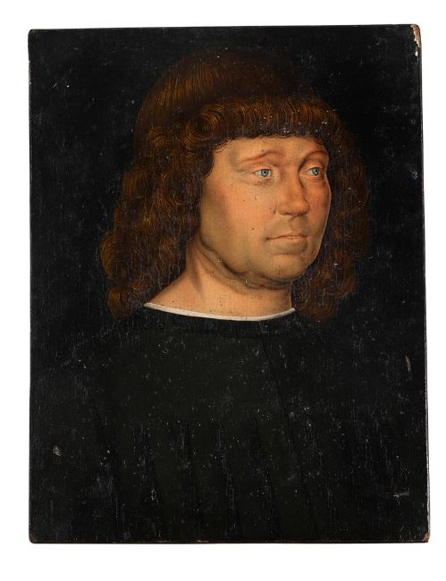 FOLLOWER OF GIOVANNI BELLINI PORTRAIT OF A MAN WITH BLUE EYES Oil on panel 31 x 23.5cm (12 x 9¼ in.) Unframed Condition Report: The panel presents a visible craquelure across the whole surface. UV light reveals a yellowing and uneven varnish applied across the whole panel, various retouches on the right hand cheek of the sitter, on the eyes, and on the upper section of the left cheek. Under UV light various sections fluoresce, maybe caused by the strengthening of the colour, especially the white section of the eyes, lips, and creases of the neck. Furthermore, a few scattered retouches are present on the black gown, and various surface scratches are visible near the borders, and especially in the lower bottom section of the panel: such scratches are of about 3cm wide. Condition Report Disclaimer