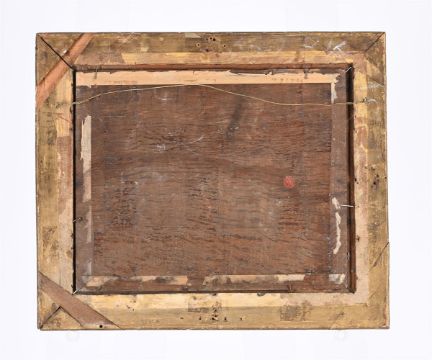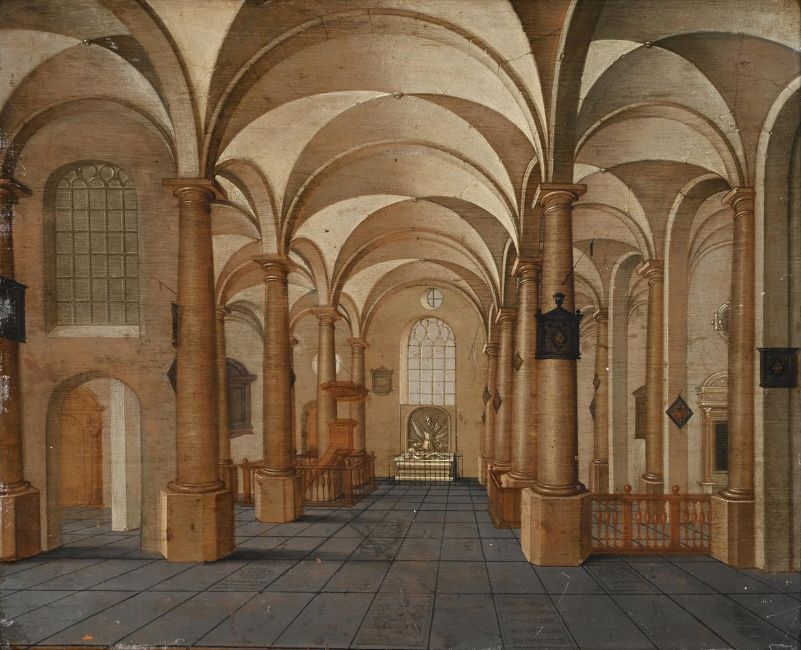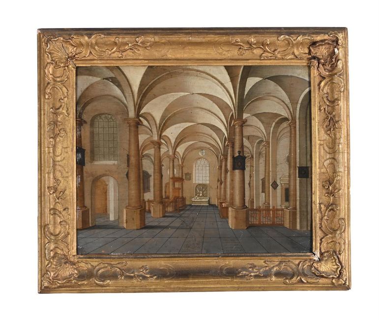 FOLLOWER OF PIETER NEEFS II AN INTERIOR OF A CHURCH WITH A TOMB AT THE CENTRE Oil on panel 31 x 38.5cm (12 x 15 in.) Condition Report: The panel is stable and appears to be in good condition. There are some fine surface cracks in the paint layer and minor abrasions. Under UV light there are scattered small areas of restoration which are in foreground and toward the centre of the left edge. It has a thick layer of discoloured varnish which has numerous scratches and abrasions. Condition Report Disclaimer