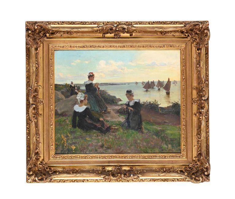 ALFRED-VICTOR FOURNIER (FRENCH 1872-1924) YOUNG BRETONS KNITTING BY THE SEA Oil on canvas Signed and dated '1906' (lower right) 52 x 63.5cm (20¼ x 25 in.) Condition Report: The canvas has not been lined. Craquelure throughout however the paint surface seems to be secure. Rubbing and abrasions to the framing edges. The upper left corner with a small pin-hole at the framing edge. Inspection under UV light reveals some light scattered infilling, mainly confined to the sky and along the framing edges.Condition Report Disclaimer