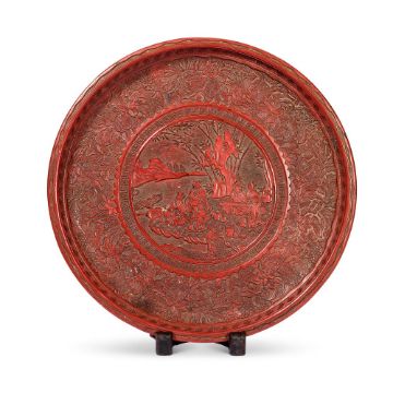 A CHINESE CIRCULAR CINNABAR LACQUER DISH QING DYNASTY (1644-1911) Carved in the 16th century style, with scholars and attendants seated in a bamboo grove, within wide floral border, the reverse similarly decorated with a wide floral band 35.7cm diameterProvenance: William Alexander Palmer, 1925-2020. 清 剔紅人物圖圓盤拍品來源:英國帕瑪家族William Alexander Palmer收藏,購於倫敦知名古董商John Sparks Condition Report: some wear and minor losses mainly to black lacquer base Condition Report Disclaimer