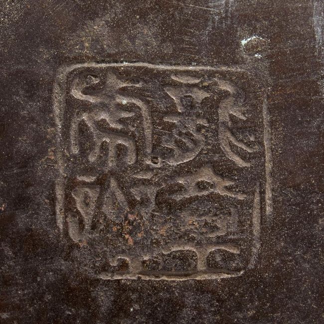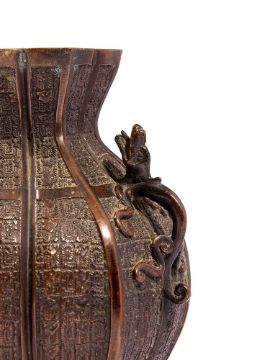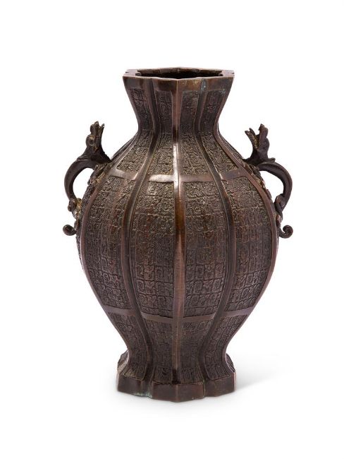 A CHINESE BRONZE 'ARCHAISTIC' VASE QING DYNASTY, 19TH CENTURY Of lobed form, with multiple panels of small stylised chilong dragons and the shoulders applied with chilong dragon handles, the base with archaistic style seal mark, 2344 grams 25cm high Provenance: The Palmer Family Collection.  清十九世紀 銅蟠螭紋仿古雙耳壺(克重2344g)拍品來源:英國帕瑪家族顯赫私人收藏 Condition Report: Verdigris to neck and footCondition Report Disclaimer