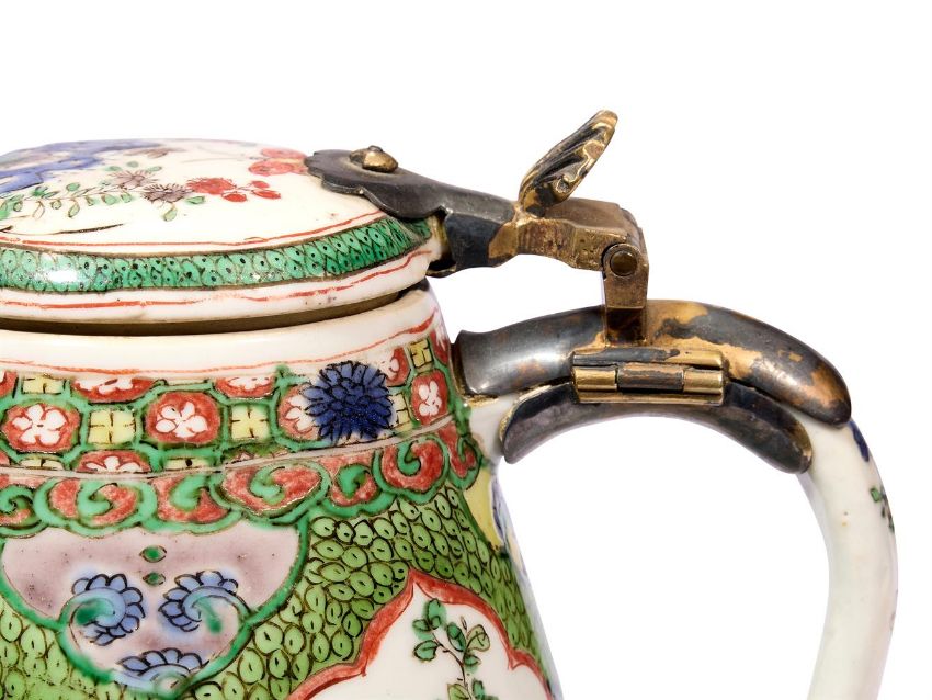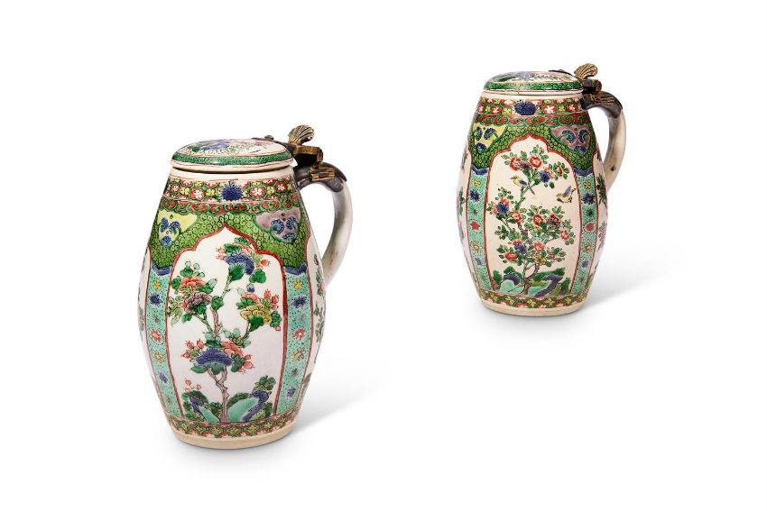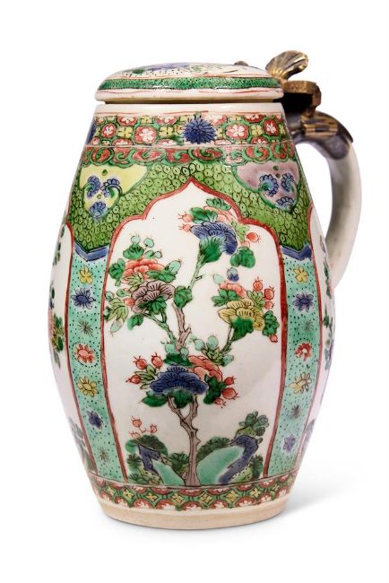 A PAIR OF CHINESE FAMILLE VERTE BARREL SHAPED TANKARDS AND COVERS QING DYNASTY, KANGXI PERIOD (1662-1722) Attached with gilt-bronze mounts, the barrel-form bodies reserved with four shaped panels enclosing birds among flowering peonies and rockwork alternating with three ruyi-head shaped panels on a fish-roe ground, the rim and foot each with a diaper band border, the cover, mounted with a silver-gilt hinges, similarly decorated with a central medallion painted with a butterfly among flowers and rockwork, affixed with large loop handles, each with Reginald Howard Reed Palmer (R.H.R.P) label number '484' each approximately 15cm high (2) Provenance: Bluett & Sons, London, May 1937, purchased for £160-0-0, as recorded in the RHRP China ledger no. C 484The Reginald and Lena Palmer Collection, no. C 484 Compare with a similar example, illustrated in Christiaan J. A. Jörg, Famille Verte: Chinese Porcelain in Green Enamels, Groninger, 2011, cat. no. 143, where the author notes that this type of tankard was probably only produced for a brief period and all existing examples appear to have similar designs.清康熙 五彩花卉圖杯一對拍品來源:英國帕瑪家族顯赫私人收藏,家族檔案編號C484號,1937年5月以160鎊的價格購自倫敦知名古董商Bluett & Sons Condition Report: one in good condition with only wear to mounts the other with repair to cover and piece re-attached to rim Condition Report Disclaimer