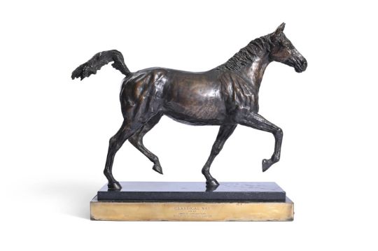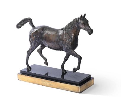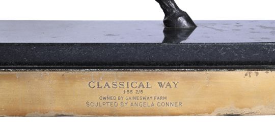 ANGELA CONNER (BRITISH B. 1935) CLASSICAL WAY Bronze Signed and numbered 12/16 (to underside) and engraved inscription to plaque 37 x 53cm (14½ x 20¾ in.) exc. base Edition 2 of 5. Provenance: Direct from the artist's studio collection 'One of the reasons I love riding is that I love the way a pair of fine reins can control the movement of a massive form.' Angela Conner Please note that this work is signed and numbered 12/16 (to underside). Condition Report: Some light surface dirt with green verdigris to one side of the horse's torso and legs. There is a small patch of white ingrained dirt/verdigris to the opposite side on the horse's mane, under the raised hoof and to the horse's underside. The engraved plaque is loose from the base. Otherwise, in good original condition.Condition Report Disclaimer