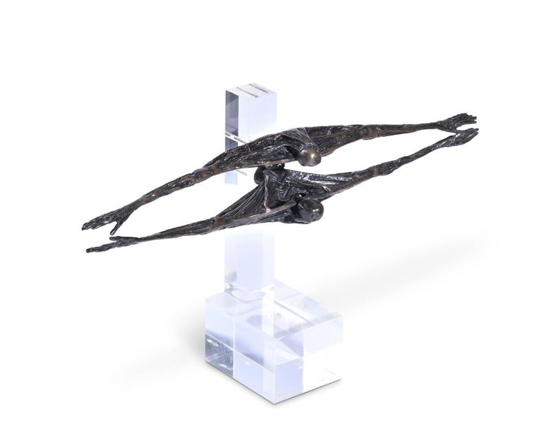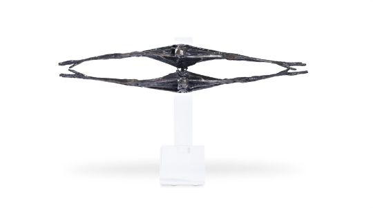 ANGELA CONNER (BRITISH B. 1935) REREDOS Bronze 10 x 43cm (3¾ x 16¾ in.) exc. base Provenance: Direct from the artist's studio collection The present work is a study for the altar which was installed at St. Andrews located in the parish of Northaw & Cuffley, commissioned by the Bishop of Saint Albans. The outstretched arms of the reflected figure span across the east wall of the altar at St. Andrews in Cuffley executed in 1967. The sculpture's tent like horizontal form juxtaposes the diagonal smooth lines of the roof's architectural design.