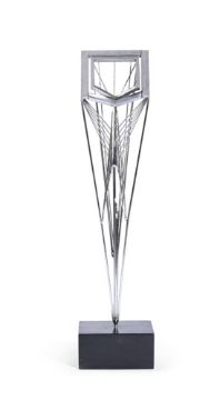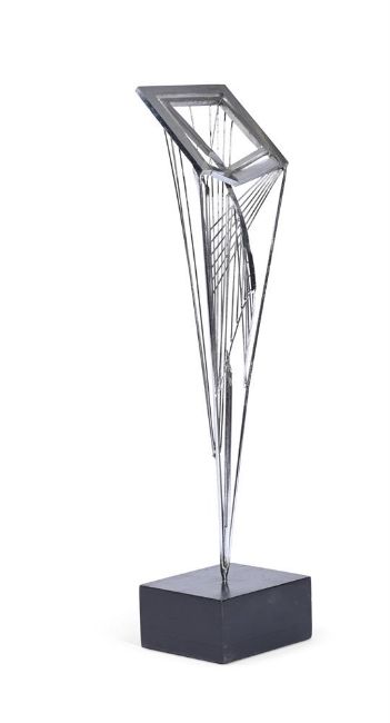 ANGELA CONNER (BRITISH B. 1935) CORIOLANUS Metal 45cm (17½in.) High exc. baseProvenance: Direct from the artist's studio collection The present lot was produced as part of a series based on Shakespearean literature for an exhibition presented by The Library & Museum of the Performing Arts at The New York Library at the Lincoln Center. The series was conducted to produce emotional responses to Shakespeare's characters creating forms not figures. Coriolanus represents two cages of steel rods, one encased with the other. The single rod running through the centre signifies the melancholy of Hamlet and the outburst of entrapment and reflective introspection radiates from this central focus. Condition Report: Some light tarnishing, otherwise in good original condition.Condition Report Disclaimer